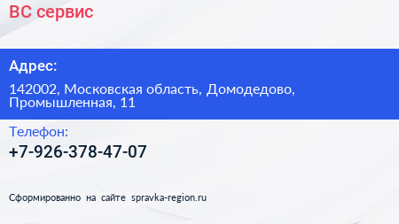 ВС сервис по адресу 142002, Московская область, Домодедово, Промышленная, 11 в дальнейшем Организация, размещена в следующих категориях: