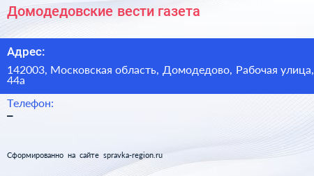 Домодедовские вести, газета по адресу 142003, Московская область, Домодедово, Рабочая улица, 44а в дальнейшем Организация, размещена в следующих категориях: