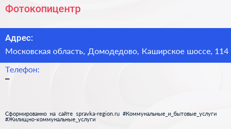 Фотокопицентр по адресу Московская область, Домодедово, Каширское шоссе, 114 в дальнейшем Организация, размещена в следующих категориях: