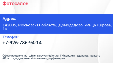 Фотосалон по адресу 142005, Московская область, Домодедово, улица Кирова, 1а в дальнейшем Организация, размещена в следующих категориях: