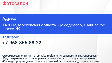 Фотосалон по адресу 142002, Московская область, Домодедово, Каширское шоссе, 49 в дальнейшем Организация, размещена в следующих категориях: