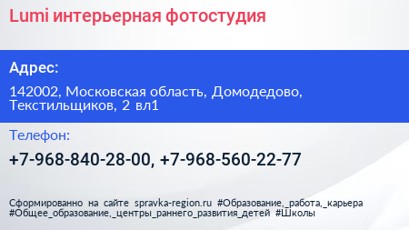 Lumi, интерьерная фотостудия по адресу 142002, Московская область, Домодедово, Текстильщиков, 2 вл1 в дальнейшем Организация, размещена в следующих категориях: