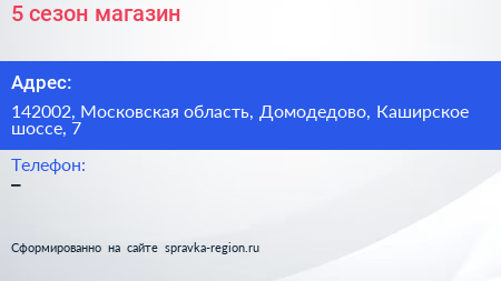 5 сезон, магазин по адресу 142002, Московская область, Домодедово, Каширское шоссе, 7 в дальнейшем Организация, размещена в следующих категориях: