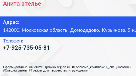 Анита, ателье по адресу 142000, Московская область, Домодедово, Курыжова, 5 к1 в дальнейшем Организация, размещена в следующих категориях: