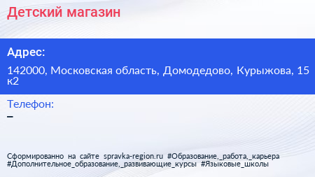 Детский магазин по адресу 142000, Московская область, Домодедово, Курыжова, 15 к2 в дальнейшем Организация, размещена в следующих категориях: