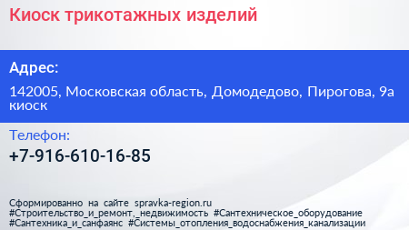 Киоск трикотажных изделий по адресу 142005, Московская область, Домодедово, Пирогова, 9а киоск в дальнейшем Организация, размещена в следующих категориях: