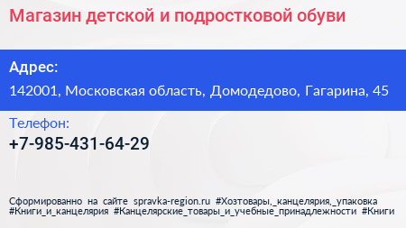 Магазин детской и подростковой обуви по адресу 142001, Московская область, Домодедово, Гагарина, 45 в дальнейшем Организация, размещена в следующих категориях: