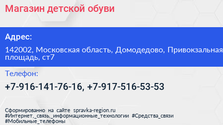 Магазин детской обуви по адресу 142002, Московская область, Домодедово, Привокзальная площадь, ст7 в дальнейшем Организация, размещена в следующих категориях: