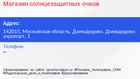 Магазин солнцезащитных очков по адресу 142015, Московская область, Домодедово, Домодедово аэропорт, 1 в дальнейшем Организация, размещена в следующих категориях: