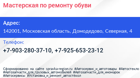 Мастерская по ремонту обуви по адресу 142001, Московская область, Домодедово, Северная, 4 в дальнейшем Организация, размещена в следующих категориях: