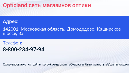 Opticland, сеть магазинов оптики по адресу 142001, Московская область, Домодедово, Каширское шоссе, 3а в дальнейшем Организация, размещена в следующих категориях: