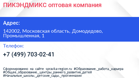 ПИКЭНДМИКС, оптовая компания по адресу 142002, Московская область, Домодедово, Промышленная, 1 в дальнейшем Организация, размещена в следующих категориях: