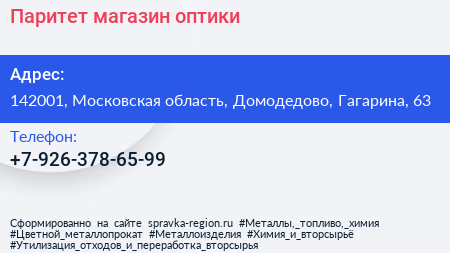 Паритет, магазин оптики по адресу 142001, Московская область, Домодедово, Гагарина, 63 в дальнейшем Организация, размещена в следующих категориях: