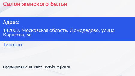 Салон женского белья по адресу 142002, Московская область, Домодедово, улица Корнеева, 6а в дальнейшем Организация, размещена в следующих категориях: