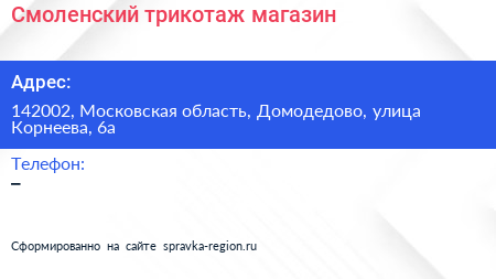 Смоленский трикотаж, магазин по адресу 142002, Московская область, Домодедово, улица Корнеева, 6а в дальнейшем Организация, размещена в следующих категориях: