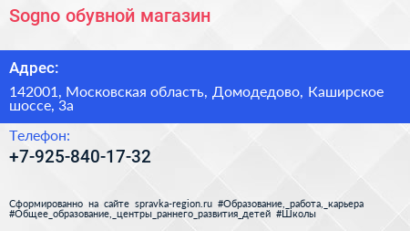 Sogno, обувной магазин по адресу 142001, Московская область, Домодедово, Каширское шоссе, 3а в дальнейшем Организация, размещена в следующих категориях: