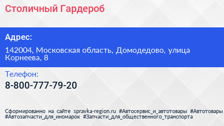 Столичный Гардероб по адресу 142004, Московская область, Домодедово, улица Корнеева, 8 в дальнейшем Организация, размещена в следующих категориях: