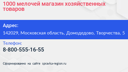 1000 мелочей, магазин хозяйственных товаров по адресу 142029, Московская область, Домодедово, Творчества, 5 в дальнейшем Организация, размещена в следующих категориях: