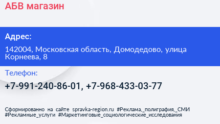 АБВ, магазин по адресу 142004, Московская область, Домодедово, улица Корнеева, 8 в дальнейшем Организация, размещена в следующих категориях: