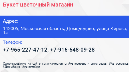 Букет, цветочный магазин по адресу 142005, Московская область, Домодедово, улица Кирова, 1а в дальнейшем Организация, размещена в следующих категориях: