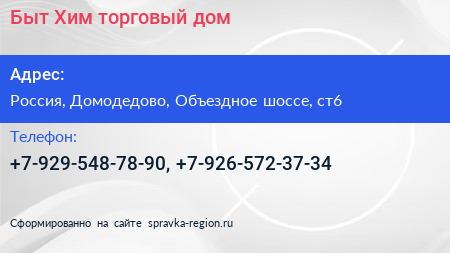Быт-Хим, торговый дом по адресу с6, Объездное шоссе, Авдотьино, посёлок Государственного Племенного Завода "Константиново", городской округ Домодедово, Московская область, Центральный федеральный округ, 142032, Россия в дальнейшем Организация, размещена в следующих категориях: