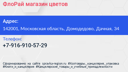 ФлоРай, магазин цветов по адресу 142001, Московская область, Домодедово, Дачная, 34 в дальнейшем Организация, размещена в следующих категориях: