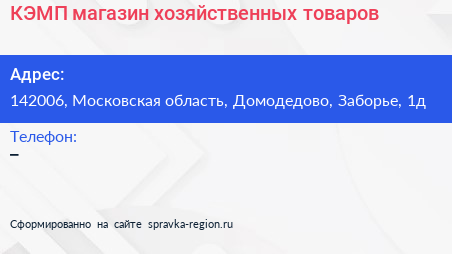 КЭМП, магазин хозяйственных товаров по адресу 142006, Московская область, Домодедово, Заборье, 1д в дальнейшем Организация, размещена в следующих категориях:
