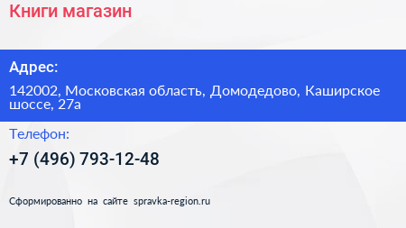 Книги, магазин по адресу 142002, Московская область, Домодедово, Каширское шоссе, 27а в дальнейшем Организация, размещена в следующих категориях: