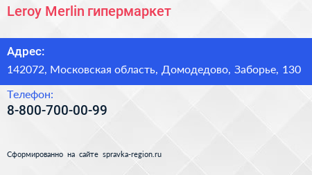 Leroy Merlin, гипермаркет по адресу 142072, Московская область, Домодедово, Заборье, 130 в дальнейшем Организация, размещена в следующих категориях:
