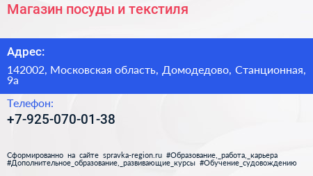 Магазин посуды и текстиля по адресу 142002, Московская область, Домодедово, Станционная, 9а в дальнейшем Организация, размещена в следующих категориях: