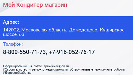 Мой Кондитер, магазин по адресу 142002, Московская область, Домодедово, Каширское шоссе, 63 в дальнейшем Организация, размещена в следующих категориях:
