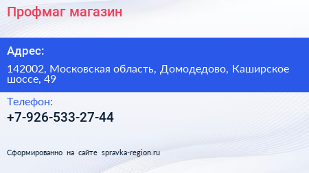 Профмаг, магазин по адресу 142002, Московская область, Домодедово, Каширское шоссе, 49 в дальнейшем Организация, размещена в следующих категориях: