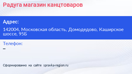 Радуга, магазин канцтоваров по адресу 142004, Московская область, Домодедово, Каширское шоссе, 95Б в дальнейшем Организация, размещена в следующих категориях: