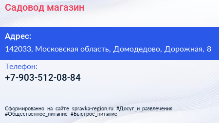 Садовод, магазин по адресу 142033, Московская область, Домодедово, Дорожная, 8 в дальнейшем Организация, размещена в следующих категориях: