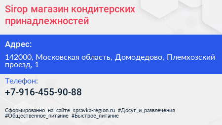 Sirop, магазин кондитерских принадлежностей по адресу 142000, Московская область, Домодедово, Племхозский проезд, 1 в дальнейшем Организация, размещена в следующих категориях: