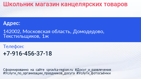Школьник, магазин канцелярских товаров по адресу 142002, Московская область, Домодедово, Текстильщиков, 1ж в дальнейшем Организация, размещена в следующих категориях: