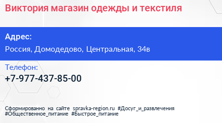 Виктория, магазин одежды и текстиля по адресу 4 с2, Объездной проезд, посёлок Государственного Племенного Завода "Константиново", городской округ Домодедово, Московская область, Центральный федеральный округ, 142032, Россия в дальнейшем Организация, размещена в следующих категориях: