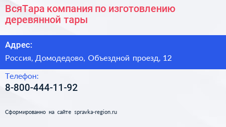 ВсяТара, компания по изготовлению деревянной тары по адресу 12, Объездной проезд, посёлок Государственного Племенного Завода "Константиново", городской округ Домодедово, Московская область, Центральный федеральный округ, 142032, Россия в дальнейшем Организация, размещена в следующих категориях: