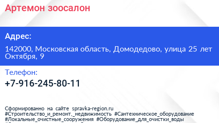 Артемон, зоосалон по адресу 142000, Московская область, Домодедово, улица 25 лет Октября, 9 в дальнейшем Организация, размещена в следующих категориях: