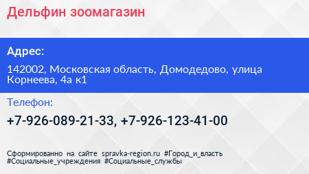 Дельфин, зоомагазин по адресу 142002, Московская область, Домодедово, улица Корнеева, 4а к1 в дальнейшем Организация, размещена в следующих категориях: