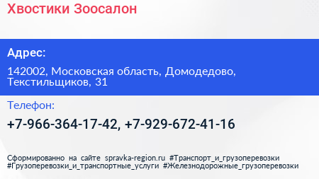 Хвостики, Зоосалон по адресу 142002, Московская область, Домодедово, Текстильщиков, 31 в дальнейшем Организация, размещена в следующих категориях: