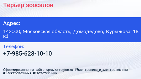 Терьер, зоосалон по адресу 142000, Московская область, Домодедово, Курыжова, 18 к1 в дальнейшем Организация, размещена в следующих категориях:
