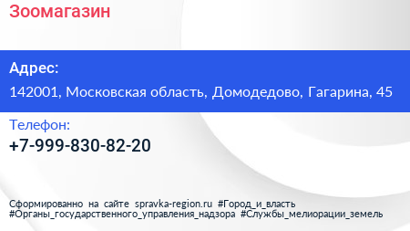Зоомагазин по адресу 142001, Московская область, Домодедово, Гагарина, 45 в дальнейшем Организация, размещена в следующих категориях: