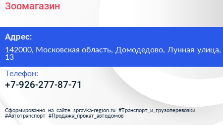 Зоомагазин по адресу 142000, Московская область, Домодедово, Лунная улица, 13 в дальнейшем Организация, размещена в следующих категориях: