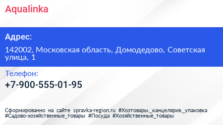 Aqualinka по адресу 142002, Московская область, Домодедово, Советская улица, 1 в дальнейшем Организация, размещена в следующих категориях: