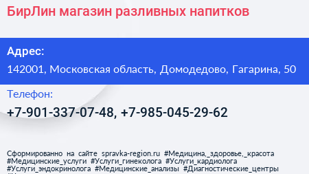 БирЛин, магазин разливных напитков по адресу 142001, Московская область, Домодедово, Гагарина, 50 в дальнейшем Организация, размещена в следующих категориях: