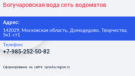 Богучаровская вода, сеть водоматов по адресу 142029, Московская область, Домодедово, Творчества, 5к1 ст1 в дальнейшем Организация, размещена в следующих категориях: