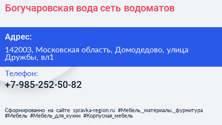 Богучаровская вода, сеть водоматов по адресу 142003, Московская область, Домодедово, улица Дружбы, вл1 в дальнейшем Организация, размещена в следующих категориях: