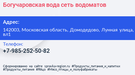 Богучаровская вода, сеть водоматов по адресу 142003, Московская область, Домодедово, Лунная улица, вл1 в дальнейшем Организация, размещена в следующих категориях: