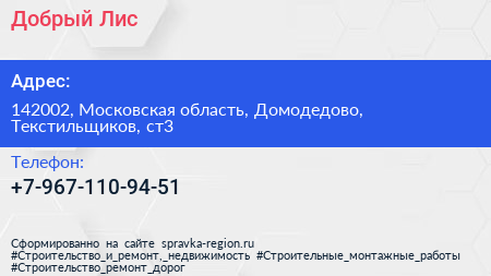 Добрый Лис по адресу 142002, Московская область, Домодедово, Текстильщиков, ст3 в дальнейшем Организация, размещена в следующих категориях: